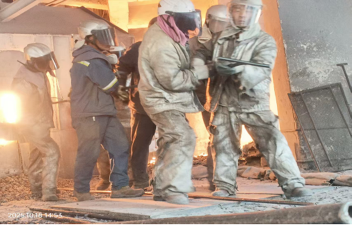 出爐工,是這里的主角。他們身著被汗水反復浸透又烤干、結出白色鹽漬的阻燃服,頭戴沉重的防護頭盔,像無畏的戰(zhàn)士,堅守在陣地的最前沿。他們的工作,是時刻關注爐況,用長長的鋼釬疏通投料口,防止“棚料”。每一釬下去,都需要全身的力氣,與爐內黏稠的料漿抗爭。汗水從額頭滾落,迷住雙眼,卻來不及擦拭,因為爐火不等人。